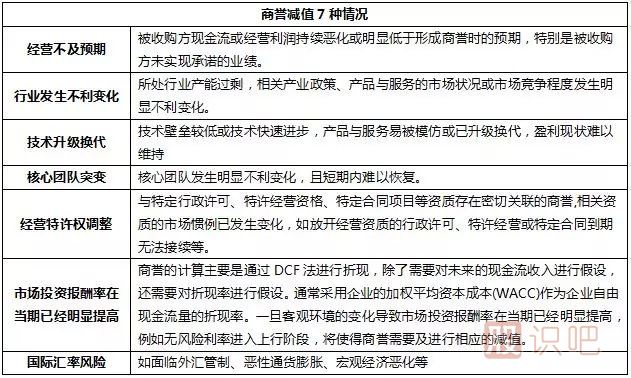 對于商譽,如果減值,幅度比一般資產大,所以經常需要對商譽的價值進行再確認、再計量,我國一般1年進行一次減值測試,減值測試之后的價值是對之前商譽賬面價值的不斷修正。商譽減值一般有七種情況,其中最常見的是經營不及預期,尤其是未實現業績承諾的情況。