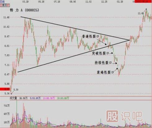 裂口可分為普通性裂口、突破性裂口,持續性裂口和衰竭性裂口四種。其中,普通性裂口發生在市場(交易標的的價格)所形成的形態之內,一般沒有具體指導交易方向的特別意義,所以也就無須勞心費神的去分析研究它了。
