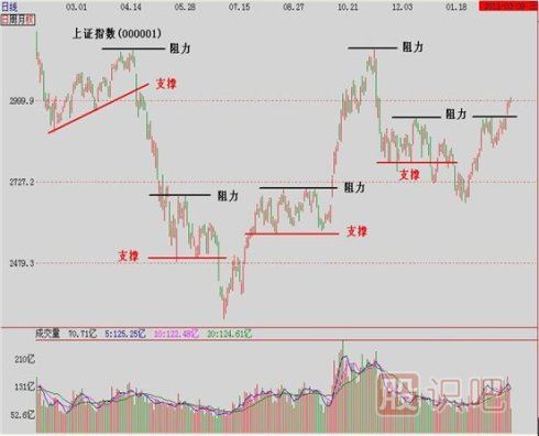 “支撐” 是指在某一價格區間內有大量的市場需求以使原本下跌的趨勢至少受到阻礙抑或是完全的改變了這種趨勢而形成上升趨勢。同理,“阻力”是指在某一價格區間內有大量的市場供給以使原本上升的趨勢至少受阻礙抑或是完全的改變了這種趨勢而形成下跌的趨勢。
