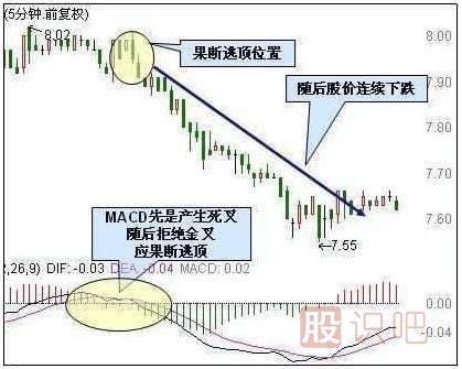 均線的死叉和MACD指標(biāo)的死叉可能在同一交易日內(nèi)出現(xiàn),也可能在幾個(gè)交易日內(nèi)相繼出現(xiàn),這都是有效的高位回調(diào)