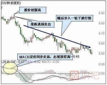 3、5分鐘MACD頂背離。股價(jià)創(chuàng)新高時(shí),MACD沒有創(chuàng)新高,MACD出現(xiàn)頂背離: