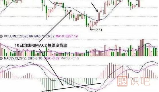 如果在均線持續(xù)下跌,連創(chuàng)新低的同時(shí),MACD指標(biāo)的綠色柱線沒有創(chuàng)新低,反而出現(xiàn)一底比一底高的形態(tài),均線和MACD柱線就形成了底背離形態(tài)。