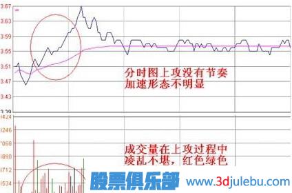 1、分時(shí)圖走勢(shì)攻擊性強(qiáng),上漲則快速拉高,同時(shí)成交量放大,在推高過(guò)程中,一般呈現(xiàn)加速上攻的形態(tài),而不能是拱形上漲。