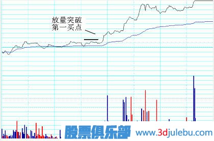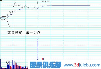 由于在這個位置股價往往具有真正意義上的第一次創下盤中的新高,第一次創下盤中的最大量能,因此這個買點把它稱之為:第一買點。第一買點的位置往往是合理的,而且投資者也比較容易從圖中的量價變化上找到這個點位。