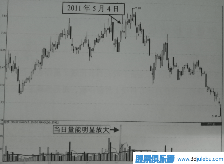 了一定的下滑,且當日量能大幅度放出。很明顯,這是市場拋盤在漲停板上大量涌出、而買盤資金承接力明顯不夠的表現,只要此時的個股處于階段性的高點,則短期內的一波深幅下跌走勢就不可避免。