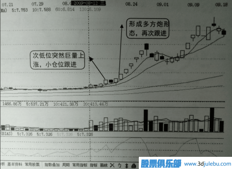 圖中顯示8月12日后的第二個(gè)交易日k線便形成多方炮格局(兩陽(yáng)夾一陰),再次跟進(jìn)是最明智的選擇,結(jié)果該股隨即出現(xiàn)連續(xù)漲停,十幾個(gè)交易日便實(shí)現(xiàn)股價(jià)翻番,由此可見(jiàn)次低位突然出現(xiàn)巨量拉升一定要引起足夠的重視,其中可能蘊(yùn)含著巨大的機(jī)會(huì)。
