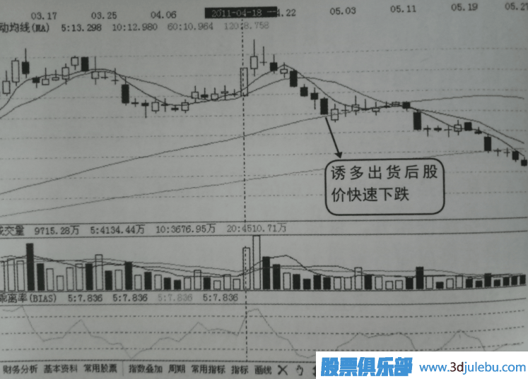 上面是莊家坐莊的整個(gè)過(guò)程,希望讀者能夠認(rèn)真體會(huì),深刻認(rèn)識(shí)量能在分析莊家行為中的重要性。如圖4所示是該股頂部區(qū)域的放大圖,圖中清晰可見(jiàn)該股在2011年4月18日當(dāng)天突然出現(xiàn)巨量拉升,股價(jià)似乎有二次走高的趨勢(shì),第二天量能更是放大,出現(xiàn)明顯沖高回落走勢(shì),隨后股價(jià)便出現(xiàn)連續(xù)大跌,該股從此進(jìn)入到散戶行情,股價(jià)一去不復(fù)返。