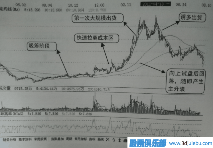 如圖3所示是海欣股份(600851) 的整體K線圖,從圖中可以看出,該股自底部起股價(jià)緩慢爬升,量能溫和放大,此階段為主力吸籌階段,隨后經(jīng)歷短暫的震倉(cāng)過(guò)程后快速拉離成本區(qū),拉離成本區(qū)后在次高位進(jìn)行橫盤(pán)震蕩并發(fā)生了一次主力試盤(pán)動(dòng)作,試盤(pán)結(jié)束后股價(jià)自由回落至前期橫盤(pán)震蕩區(qū)域,隨即產(chǎn)生主升浪,股價(jià)大幅上漲,進(jìn)入翻倍區(qū)域后量能明顯放大,主力進(jìn)行第一次大規(guī)模出貨,隨后股價(jià)明顯回落,為了將手中剩下的籌碼出貨殆盡,主力便設(shè)計(jì)了第二次拉高誘多出貨,也就是圖中所示的2011年4月18日位置,隨后股價(jià)便大幅下跌,從此一去不復(fù)返,主力出貨宣告成功,炒作告一段落。