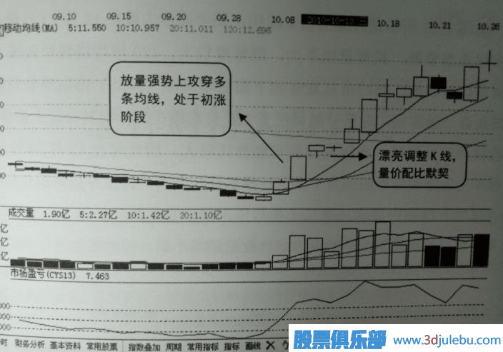 如圖2所示是中信證券(600030) 的日k線圖,圖中顯示該股在10月13日有明顯的回靠均線動作,且收縮量陽十字星,屬于強(qiáng)勢調(diào)整,整個形態(tài)比較完美。第二天該股出現(xiàn)放量上攻,且輕松站上120日均線,觸發(fā)介入條件,果斷買入。