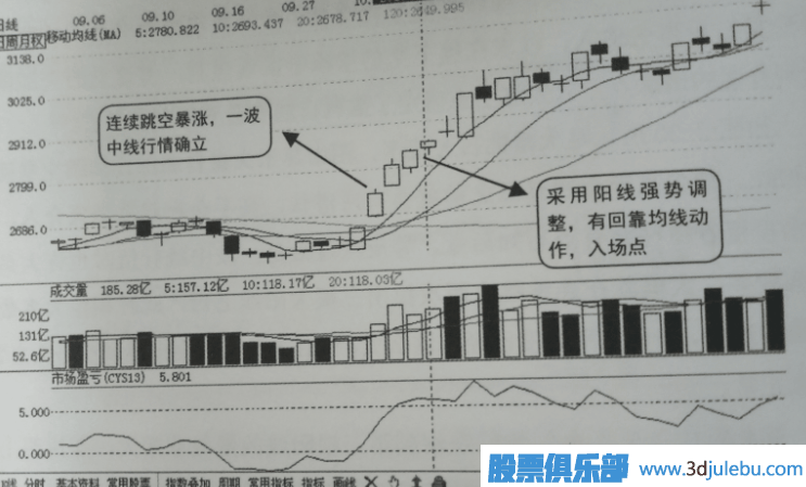 如圖1所示是大盤的日K線圖,圖中顯示大盤自底部連續(xù)跳空暴漲,氣勢如虹,頂尖高手會在暴漲之前就會有所潛伏,高手會在起漲當(dāng)天介入,而一般的投資者往往會有點(diǎn)后知后覺初學(xué)者如何看盤及k線圖強(qiáng)調(diào)大盤暴漲個股如何才能追高買入,等反應(yīng)過來是波中線行情時 也許大盤已經(jīng)上漲較多,大概就在連續(xù)跳空兩次拉出三根大陽線之后,此時相信大多數(shù)人是不敢跟進(jìn)的,畢竟上漲幅度已經(jīng)有這么大,擔(dān)心大盤馬上會出現(xiàn)調(diào)整是人之常情,非常正常。