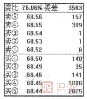 從圖中看出:主力在68.50元掛出140手買單后(其實不止這么點,前面已經成交了幾百手)。然后在68.45元和68.44元分別掛出兩個四位數大買單,中間“跳躍”了68.49、68.48、68.47、68.46四個價位(注意,68.49的35手買單和68.46元的141手買單是散戶的掛單,不是主力的掛單),其中68.48和68.47兩個價位無任何掛單,就是說連散戶的掛單也沒有。這是因為主力根據市場喜歡在整數位掛單的習慣,故意在非整數處68.44元掛出2825手買單,以起到接盤的烘托作用。