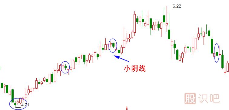 小陰線第六節小陰線小陰線形態與特征描述小陰線是指開盤價與收盤價波動范圍較小,上下影線時有時無,即使有也是很短的K線。(如圖)小陰...