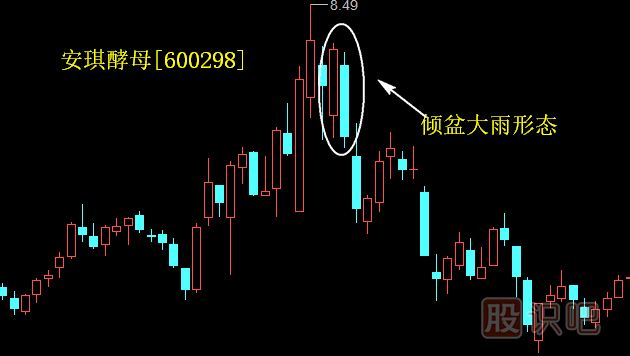 傾盆大雨形態傾盆大雨形態實例:安琪酵母(600298)股價在2013年5月和6月的反彈行情中,在6月26日和27日形成一個傾盆大雨形態,結束了反彈行情,...