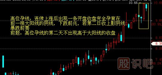 4。孕之兵K線圖。通常情況下我們把高位出現一根大陽線之后,緊接著在這根大陽線實體中間部位出現小陰線我們稱之下跌孕,反之,在低位出現一根大陰線后,緊接著在這根大陰線實體部位出現小陽線我們稱之為上漲孕,通常孕之反轉屬于被動性的較多,因而反轉的速度較慢。如圖:
