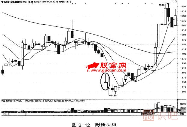所謂倒錘頭線,是一根實(shí)體很小上影線很長的線形,他有廣義和狹義之分,廣義的倒錘頭線,既可以出現(xiàn)在頂端,也可以出現(xiàn)在底端。狹義的僅指出現(xiàn)在底部的。