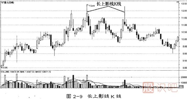 出現(xiàn)在頂端的規(guī)范的稱謂是頂部長上影小K線,俗稱“射擊之星”,表示股價(jià)將下跌。出現(xiàn)在底端的被稱謂是底部長上影小K線,俗稱“倒錘頭線",是行情已經(jīng)下跌到一定深度后出現(xiàn),表示市場多頭已經(jīng)開始反抗,隨時(shí)都有可能見底(圖2一12)。