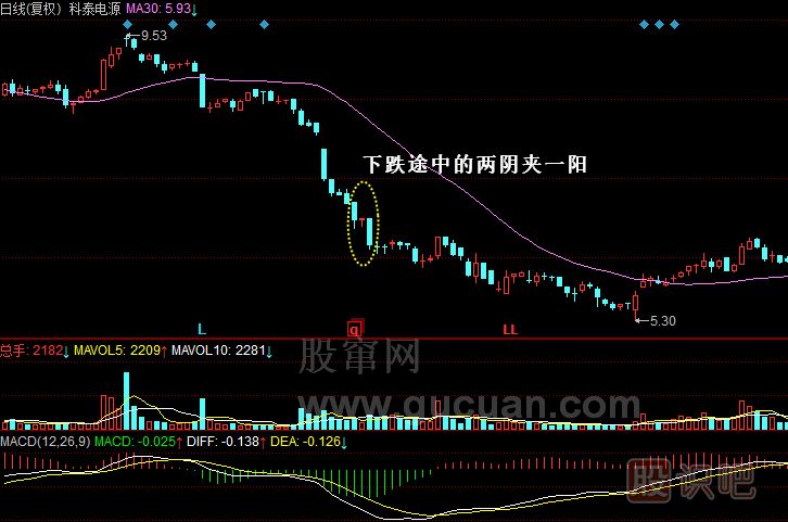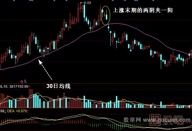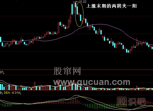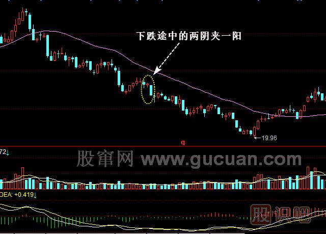 當兩陰夾一陽出現在下以趨勢中時,對股價有助跌的作用,表示后市繼續看跌。