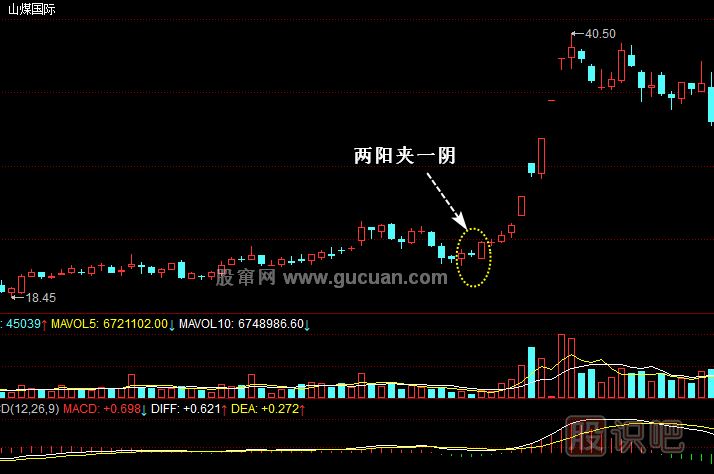 如圖4所示,山煤國際(600546)圍繞30日均線筑底完成后,股價在22.00元一帶形成兩陽夾一陰K線組合。通過對三根K線的力量進行對比可以清晰地發現,市場的主流資金仍然以做多為主,絲毫沒有拋售股票的跡象。既然如此,投資者完全可以跟隨主流資金一直做多。從圖中可以看到該股后期的走勢非常強勁,投資者若及時跟進,獲利必然會非常豐厚。兩陽夾一陰屬于短線性的K線組合形態,其中處于箱頂和上升中途的,要求以短線進出為好,并不適合中長線投資者的參與,只有那種處于底部的才適合中長線投資者逢低買人。