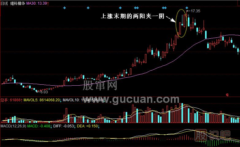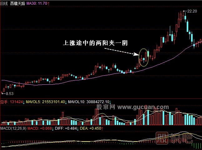 2.兩陽夾一陰這種K線組合形態的構造過程屬于莊家的震倉行為,第一天容易使人獲利了結,第二天由于出現陰包陽現象,更會誘使人拋出手中籌碼,而第三天又容易令已拋出籌碼者十分懊悔,不愿買回。一旦兩陽夾一陰這種K線組合形態明顯構成,不管是空倉者還是剛被震出倉者,均可立即半倉介人,另外半倉可待該股的價格創出新高后再次介人。兩陽夾一陰K線組合出現在股價處于明顯的上升通道中時,則往往是莊家洗盤所導致的,預示著后市股價將會繼續向上運行,但是前提是截至出現這種形態時股價的上漲幅度并不是很大。