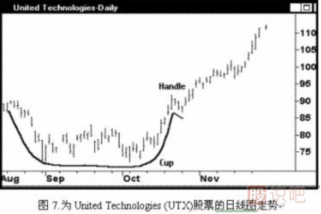 例圖7.為United Technologies (UTX)股票的日線圖走勢,注意其杯把部分的回抽恰到好處,僅僅數日即宣告完成。