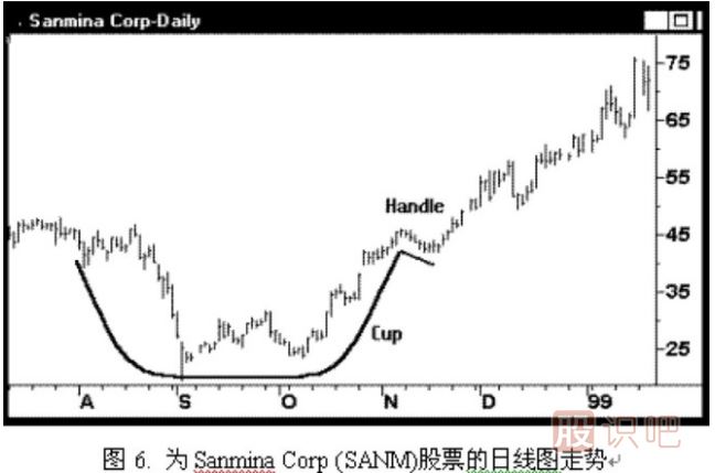 例圖6. 為Sanmina Corp (SANM)股票的日線圖走勢,科技股經常成為上佳的“杯與杯把”形態的候選品種,原因是投資者總是更樂于追捧這類股票