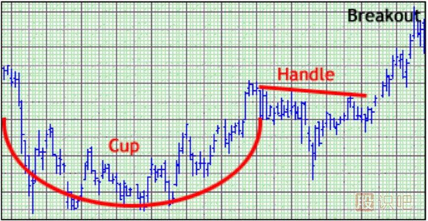 杯柄形態是一個牛性的持續形態。如它的名字所示,這個形態有兩個部分:杯和柄。其中杯是在一段上漲后形成,看起來像個圓形底,當杯的部分完成后,出現一段盤整行情,這就是柄。當柄這段盤整行情被突破后,價格將延續此前的上漲趨勢。