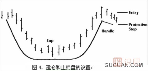 例圖4,所顯示的是建倉和止損盤的設置,當股價突破當前的高點后才建倉,這時該股票已經重納升軌,此時建倉實為順水推舟,假如股價跌破杯把的低點將宣告這一形態失效,此時在貼近杯把底部的下放設置止損盤可以將損失降至最低。