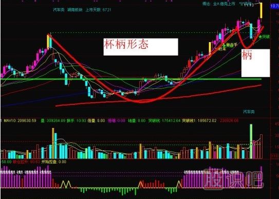 4、柄:有時候,這個柄會以向下傾斜的旗形或者小三角形態出現,有時候則只是一個簡單的小幅回撤。柄回撤的幅度可以達到杯上漲高度的1/3,最好不要超過這個幅度。柄回撤的幅度越小,該形態的牛性就越足,突破時表現得也越顯著。
