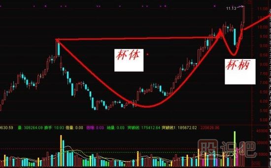 不過,這一平靜的格局通常不會持續較長時間,激進的炒家就會開始買進,試圖在一個潛在的新一輪上升趨勢來臨之際強搭早班車,這樣便產生了一個杯的右半部分,當這一回升走勢接近杯的左半部分的上方時,那些有幸在盤局或股價剛開始突破時就搶得籌碼的交易者開始獲利回吐,同時那些在股價下跌以前就建立多倉的炒家也迫不及待地匆忙平倉,其結果便造就了杯把的誕生。