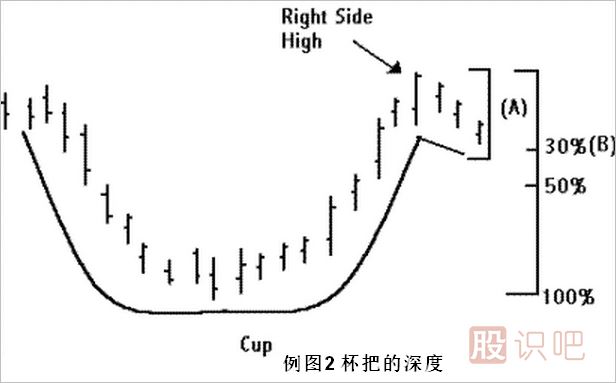 與此相關的是,杯的深度也是具有爭議性的,我們通常認為,一個標準杯的底部至少要比杯的左半部分高點要低20%,但不應超過40%,例如,若杯的左半部分高點為100元的話,則杯的底部應當處于60元(低20%)至80美(低40%)之間。