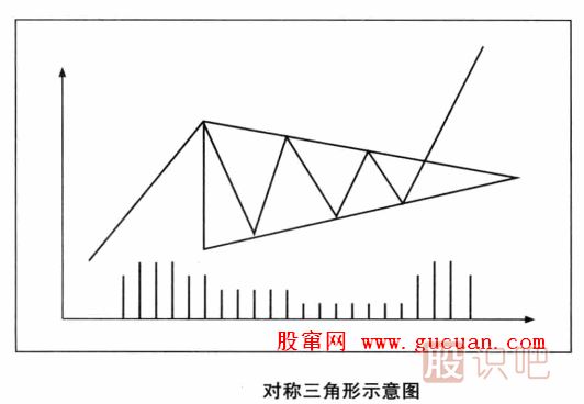 在一般情況下,三角形屬于持續整理形態。三角形形態又可分為對稱三角形、上升三角形和下降三角形。由于三者的形成過程和判斷時需要注意的地方都基本相同,在這里以對稱三角形為例來介紹。