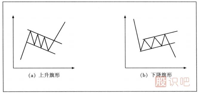 旗形走勢的形態就像掛在旗桿上的一面小旗,通常出現在快速大幅度的市場波動中,是一種經常出現的中段整理形態。一般來說,旗形又分為上升旗形和下降旗形。其中上升旗形是股價在經過陡峭上升之后,進入一個稍微向下傾斜的狹窄區域進行整理,上下界限就是兩條向下傾斜的平行直線。而下降旗形是股價在急速下跌之后,進入一個稍微向上傾斜的狹窄區域進行整理,其上下界限也是兩條向上傾斜的平行直線。