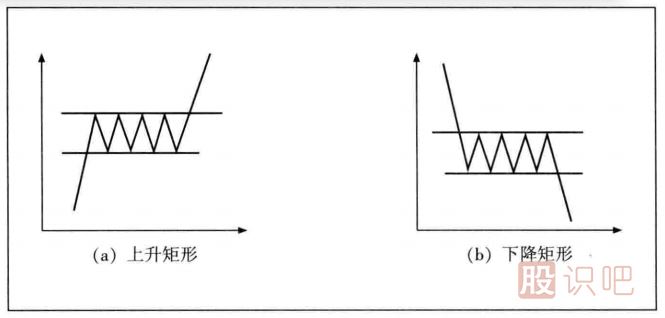 如圖是矩形形態示意圖,其中左邊是上升矩形走勢圖,右邊是下降矩形走勢圖。需要注意的是,矩形形成過程中,成交量逐漸遞減,向上突破時,需要有大成交量的配合,向下突破則沒有這種需求。此外,股價突破矩形形態后,其上漲或下跌的幅度至少為矩形本身的寬度。