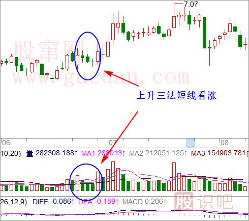 上升三法組合更多地出現在行情上漲的過程中。拉出大陽線之后,雖然連續出現了三根小陰線,但這可能是股價啟動前的下蹲動作,短暫蓄勢之后,股價將再度拉升。