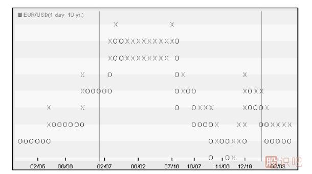 在我們使用的看盤圖表中,常見的技術圖表主要包括K線圖、柱狀圖、收盤價線圖、點數圖。據考證,股市交易者最早使用的是點數圖技術。維克托·德維利爾斯在1933年出版的《點數圖預測股價方法》一書中首次提及點數圖。點數圖中"X"形狀組成的列表示價格上升,"O"形狀組成的列表示價格下降。只需要用到最高價、最低價就可以畫出點數圖,如圖1-1所示。但是現在很少有人使用這一圖表,且很多看盤軟件不再提供這種看圖方法。